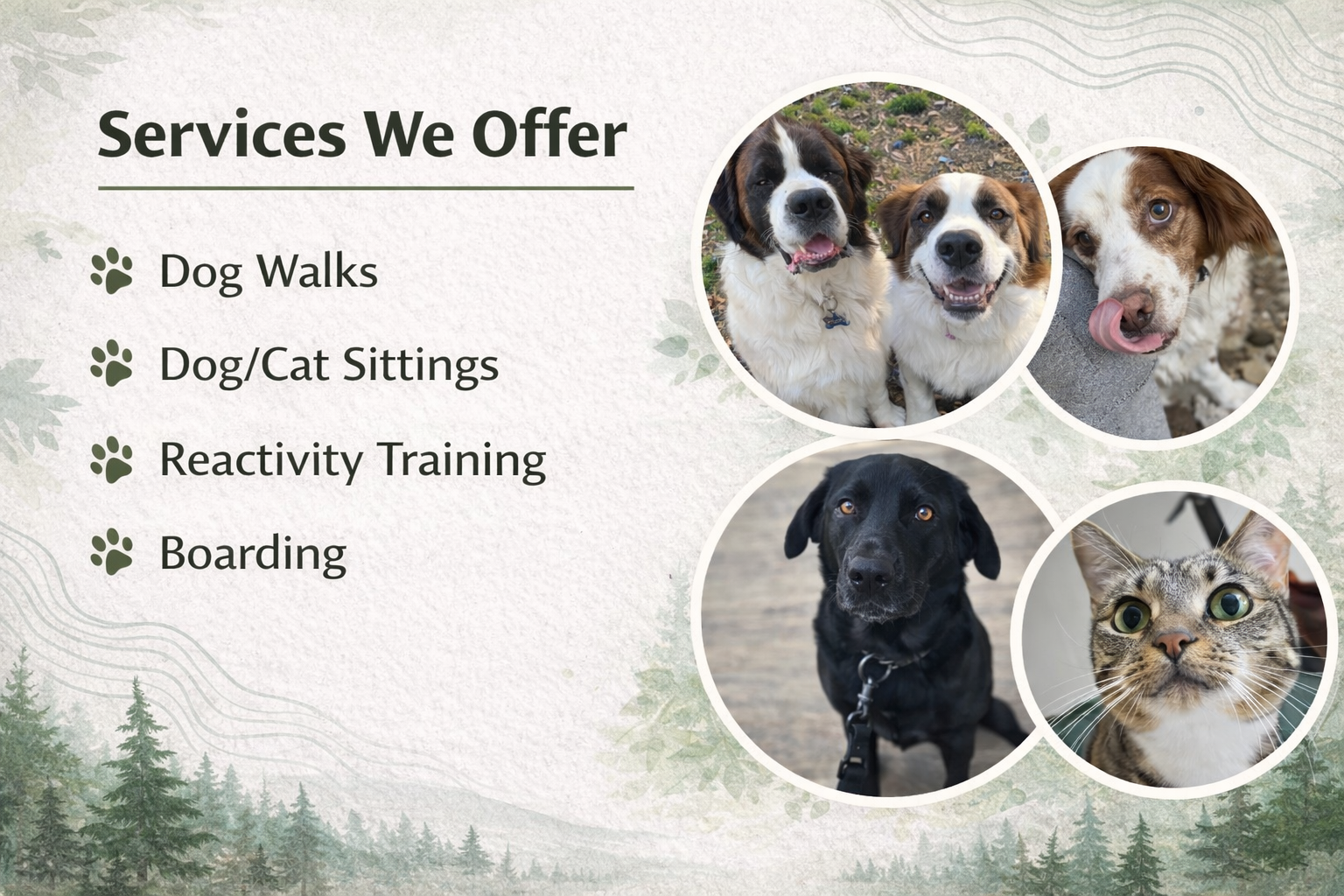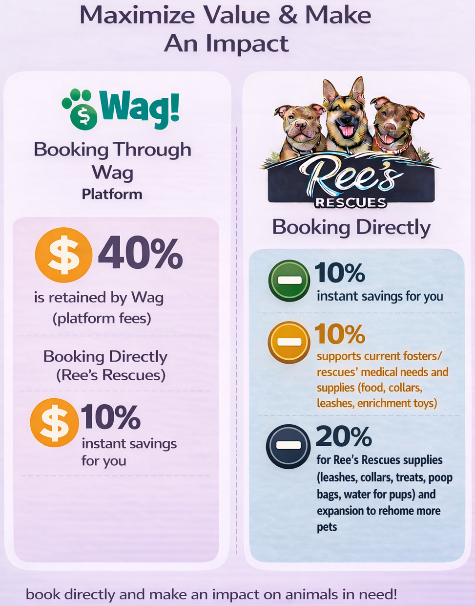 We believe in the power of patience, trust, and consistency, and we are honored to work alongside pet parents and adopters to support dogs every step of the way. Every service booked helps further our mission to rescue, train, and advocate for dogs who deserve a second chance at a better life.